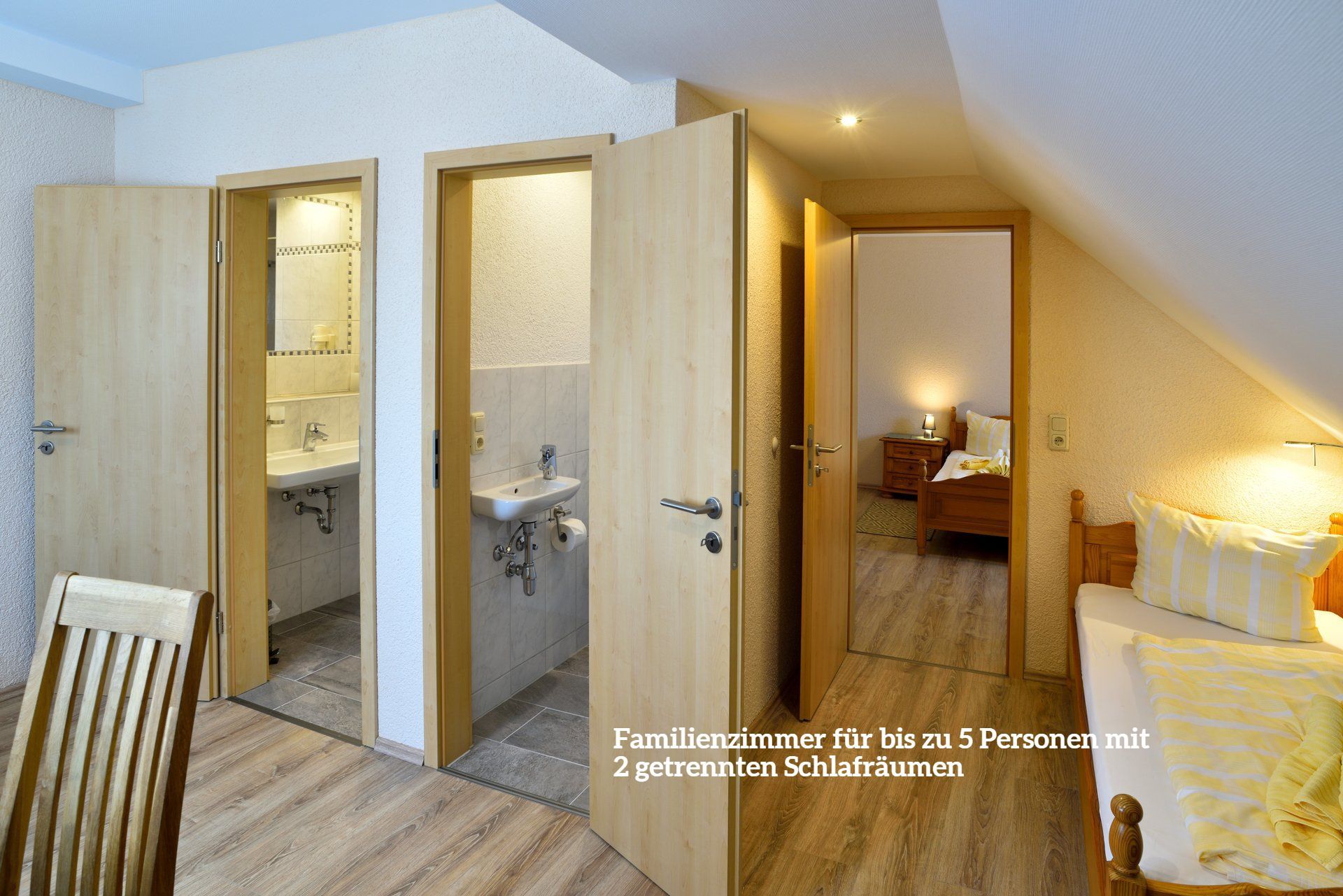 - 3 Familienzimmer ( bis zu 5 Personen in jeweils 2 getrennte Schlafräume)